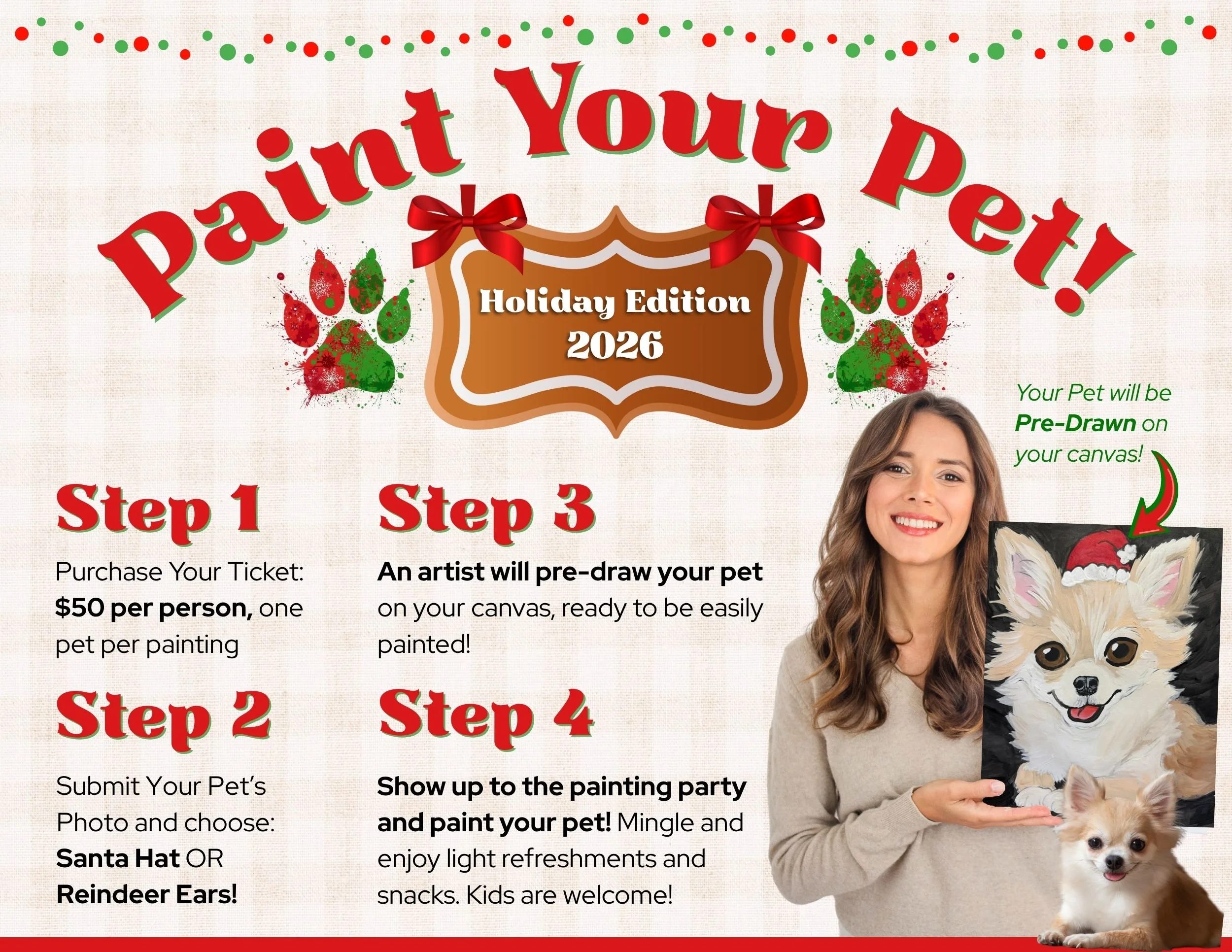 Please fill out the brief form below and use it to submit your pet’s reference photo. (One pet per painting!) ALL PETS ARE WELCOME - horses, reptiles, fur-babies, you name it! If you purchased multiple tickets, you can still submit multiple pet photos here. Bookmark this page for future reference. Below this are more event details if you have any questions. See you on Friday, November 28th at 6:30PM!